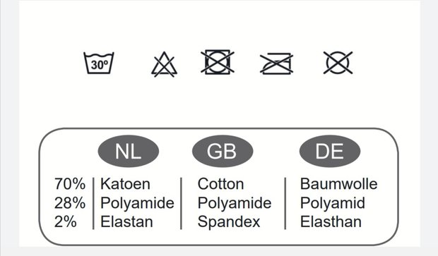 Tot 40 graden, geen bleek, niet strijken en afgeraden in de droger vanwege snellere slijtage