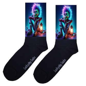 Onze computer print sokken hebben allen een zwarte voet van 100% katoen met een polyamide schacht.